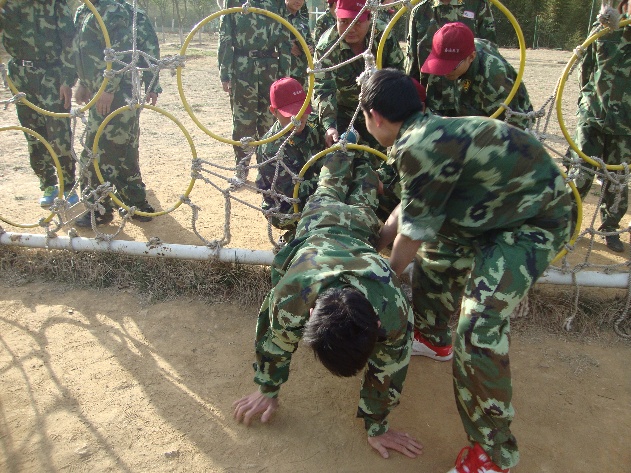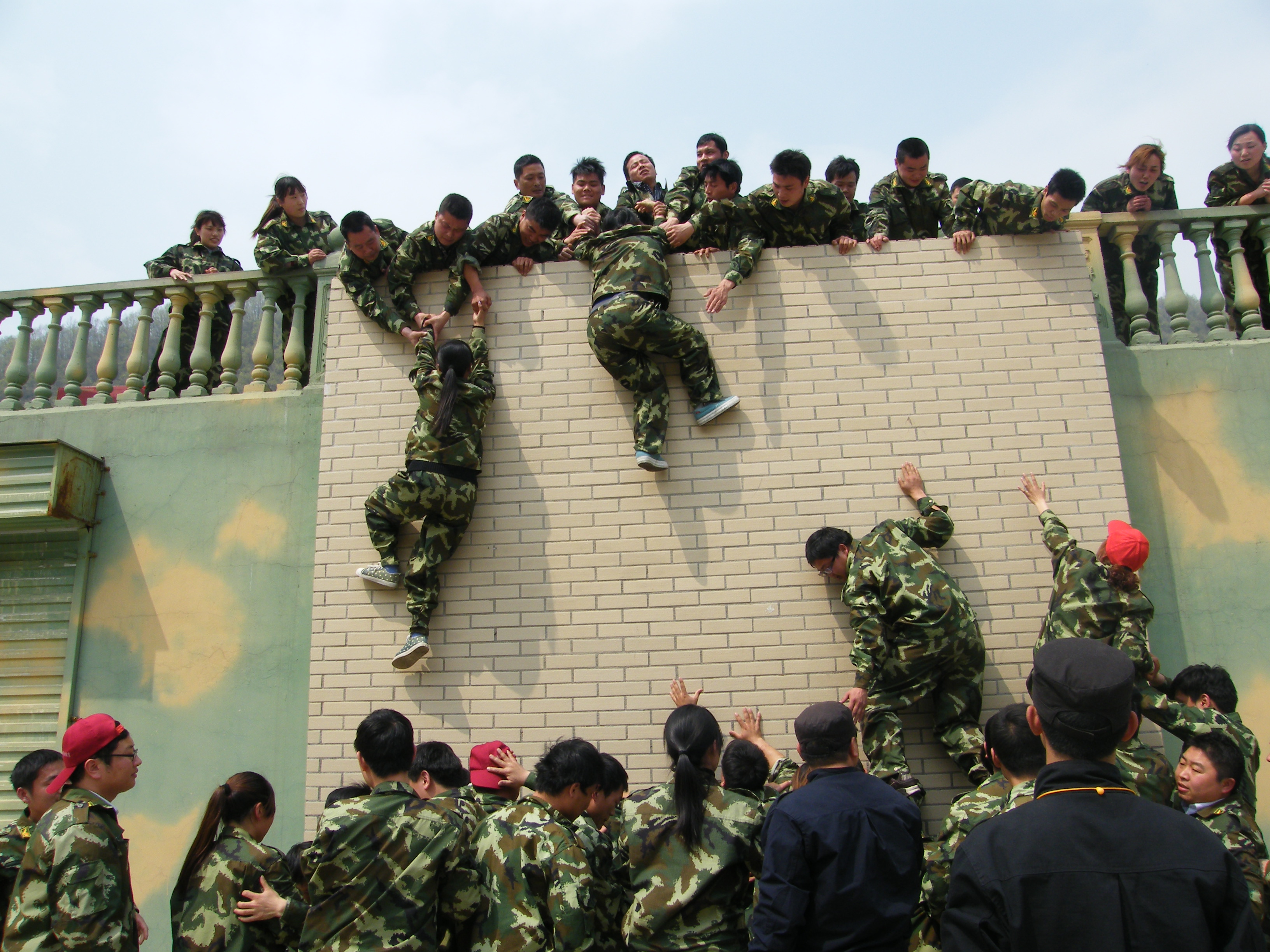 畢業(yè)墻:每個人都要翻越一堵大約4米且垂直的圍墻,這又是一個必須依靠集體的力量才能完成的項目。剛開始,大家都認為這是很難完成而且比較危險的任務,估計需要半個小時,甚至一個小時才能全部通過。 通過集思廣益,我們擬定了計劃,采用“疊人墻”的方法,讓身強力壯的隊員作為底座,先由兩三位隊員踩在他們的肩膀,大家奮力將他們先托上高墻,然后他們在上面接應,其他同伴踩著底座同伴的肩膀,一個一個成功地翻越了高墻。整個過程歷時不過5分鐘,活動結束后,所有隊員都為自己和團隊的精彩表現鼓掌、歡呼,那一刻的場面激動人心! 此項目心得體會:首先要感謝作為底座的幾位隊友,十幾個同伴踩在他們的肩膀上,汗水、沙土粘滿了衣服,肩膀被踩出紅紅的血痕。他們的奉獻和付出,換來了團隊的成功。無論在工作還是生活中,只有放下自私、愿意付出、為別人著想、才能成就自己,完成目標。